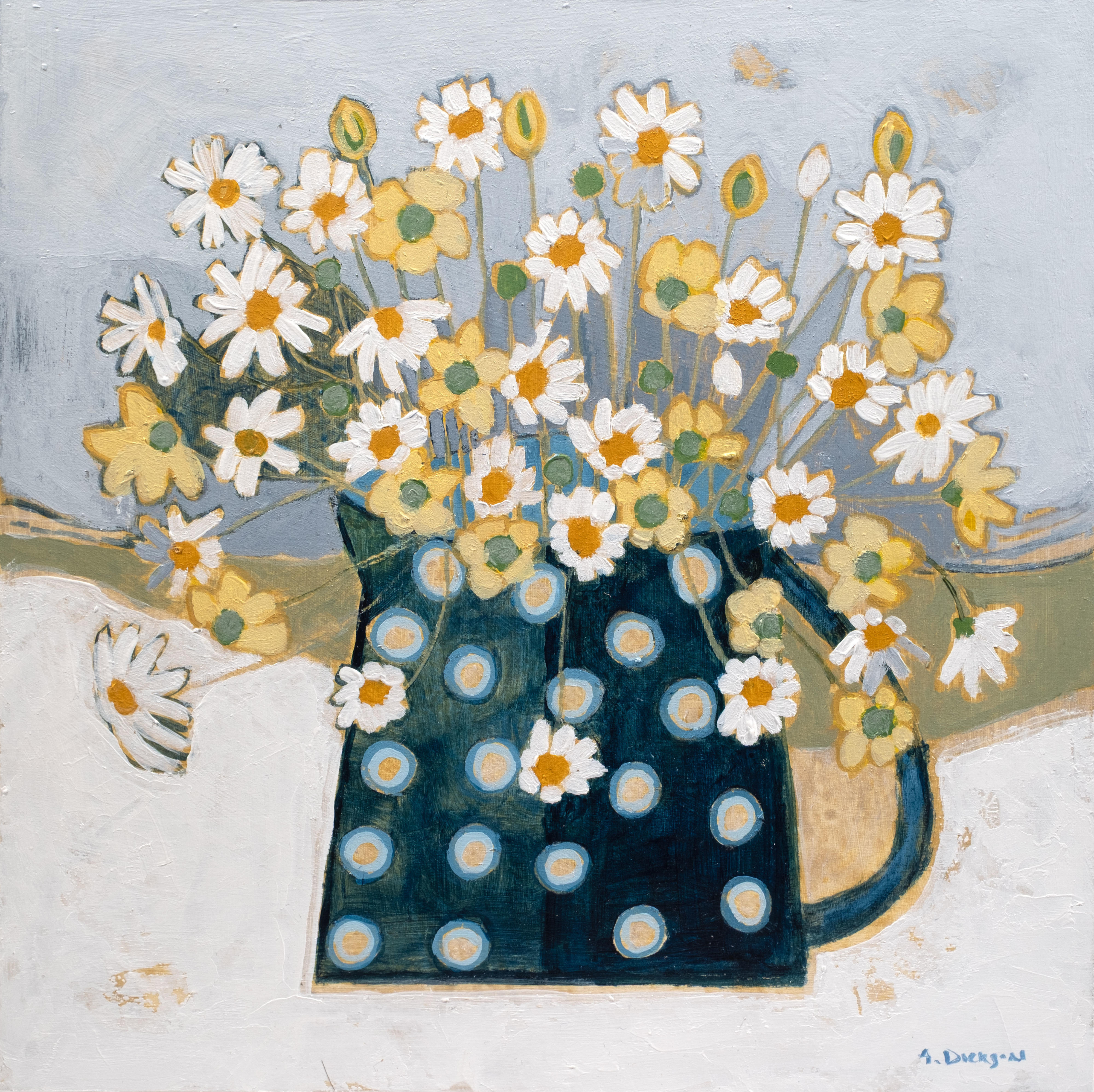 Alison approaches her paintings in a structured manner but brings them to life intuitively. Using a limited palette, shapes, colours and patterns are simplified to create a level of abstraction. It is not unusual for her to use skewers, knives and sometimes collage to create shifting dynamics within each piece.