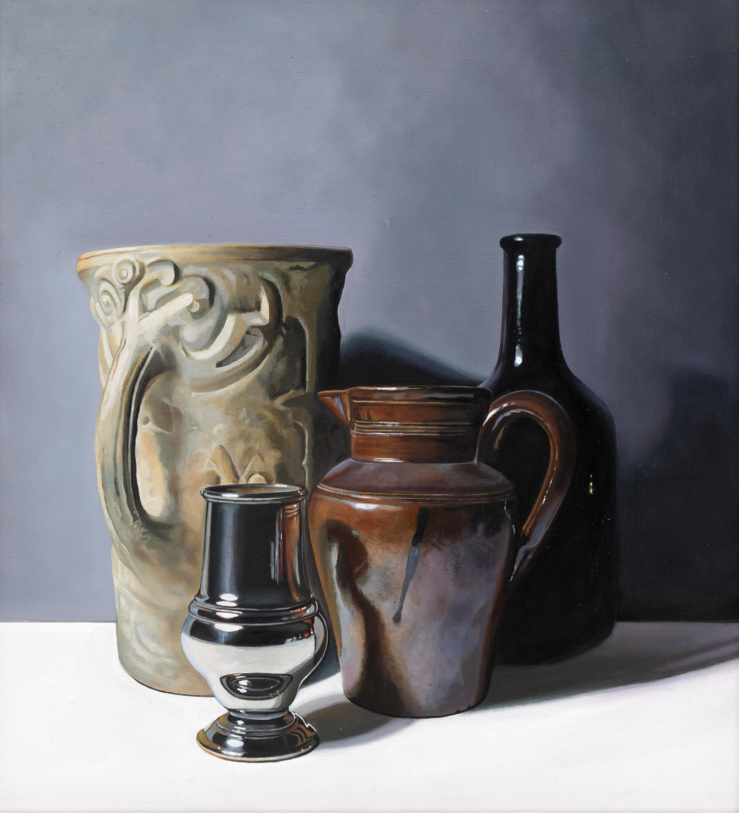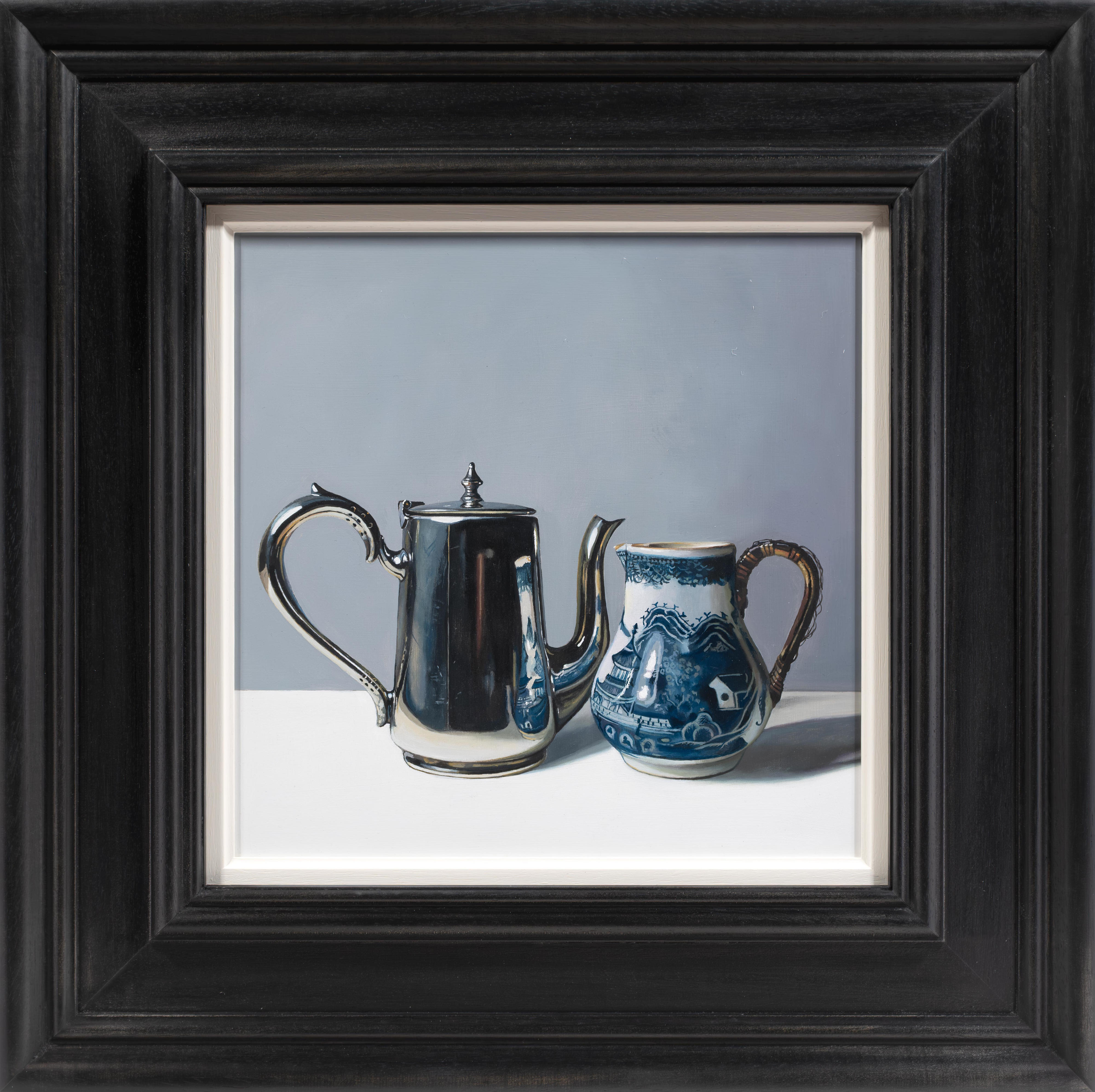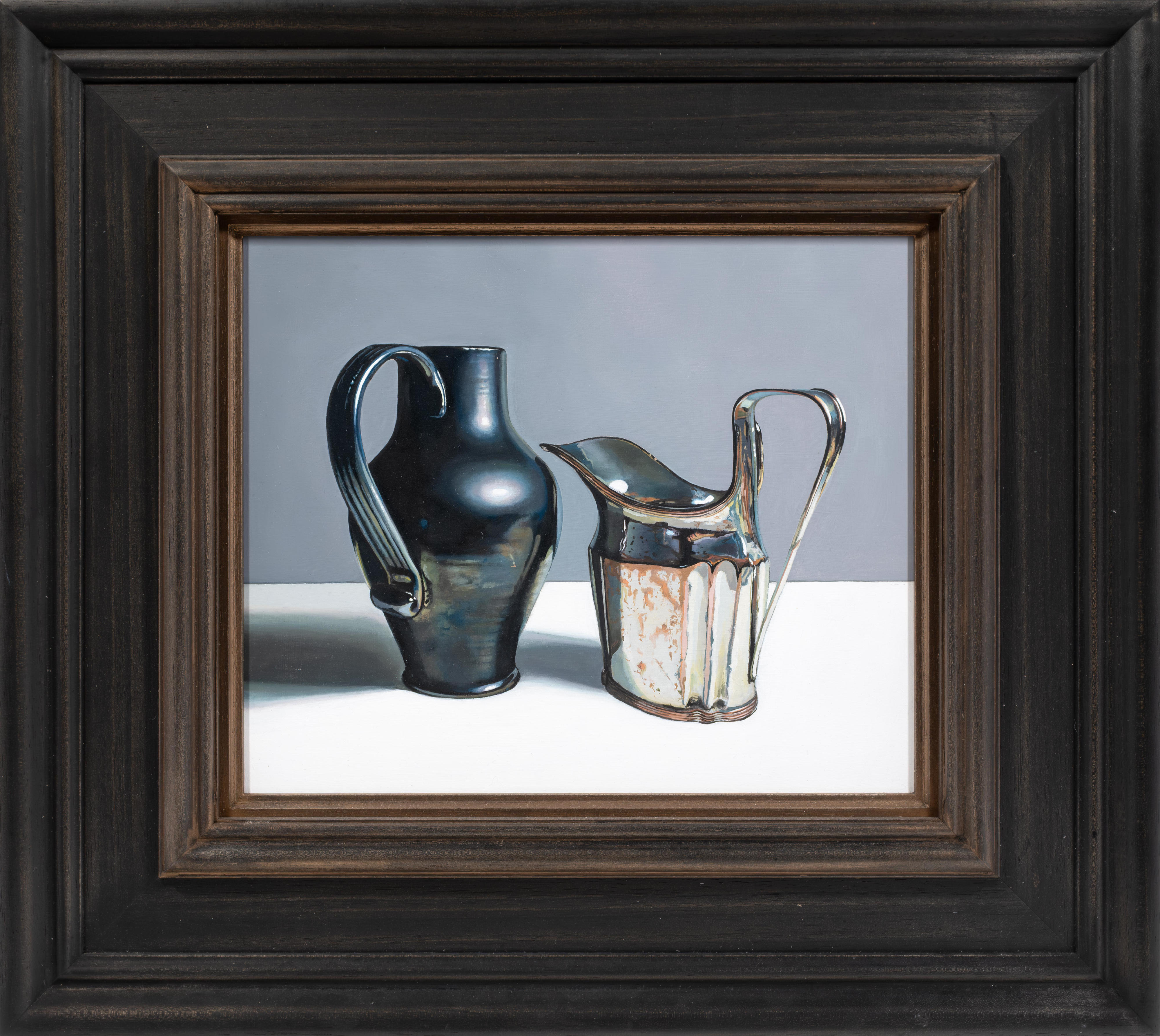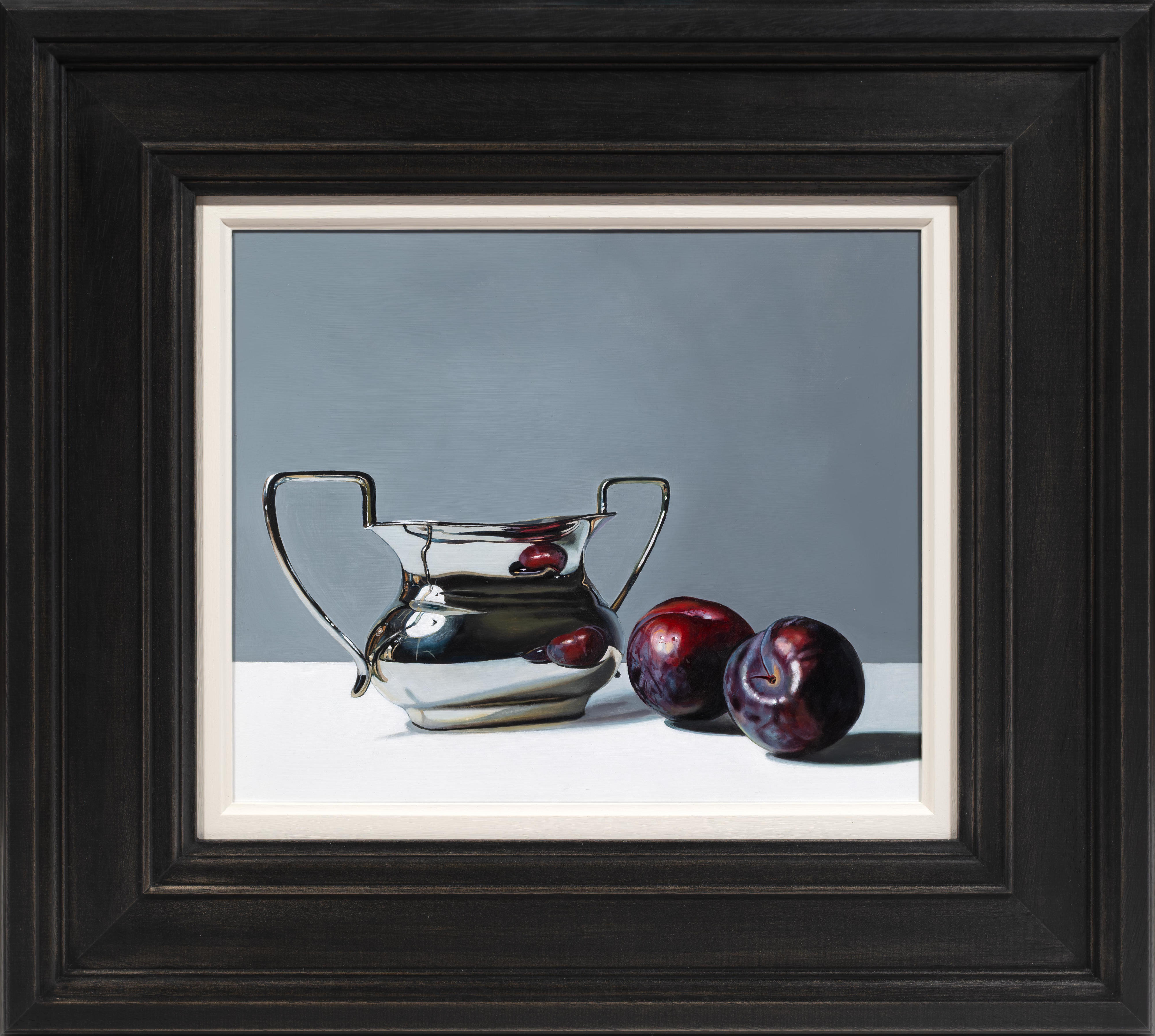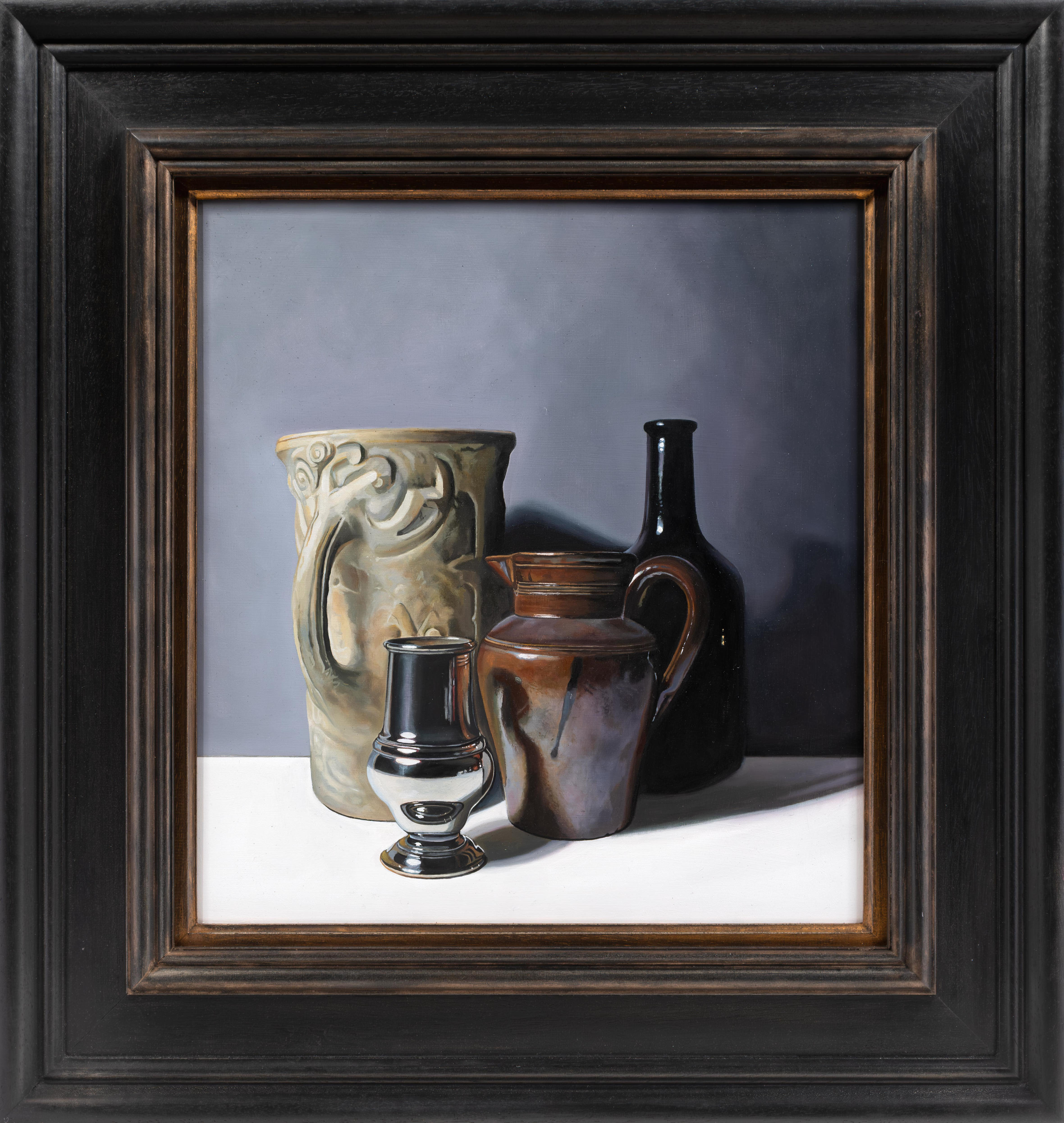 Using recognisable subject matter Jane employs an intense realism in her paintings, whether painting still life or portraits, always depicting her subjects with clarity and depth. She is particularly fascinated by the everyday objects of the past – candle snuffers, earthenware bottles and antique books. Attracted to the subtle play of light and reflections across each surface, Jane’s paintings are both intimate studies of everyday objects and reminders of the great works of the Old Masters.