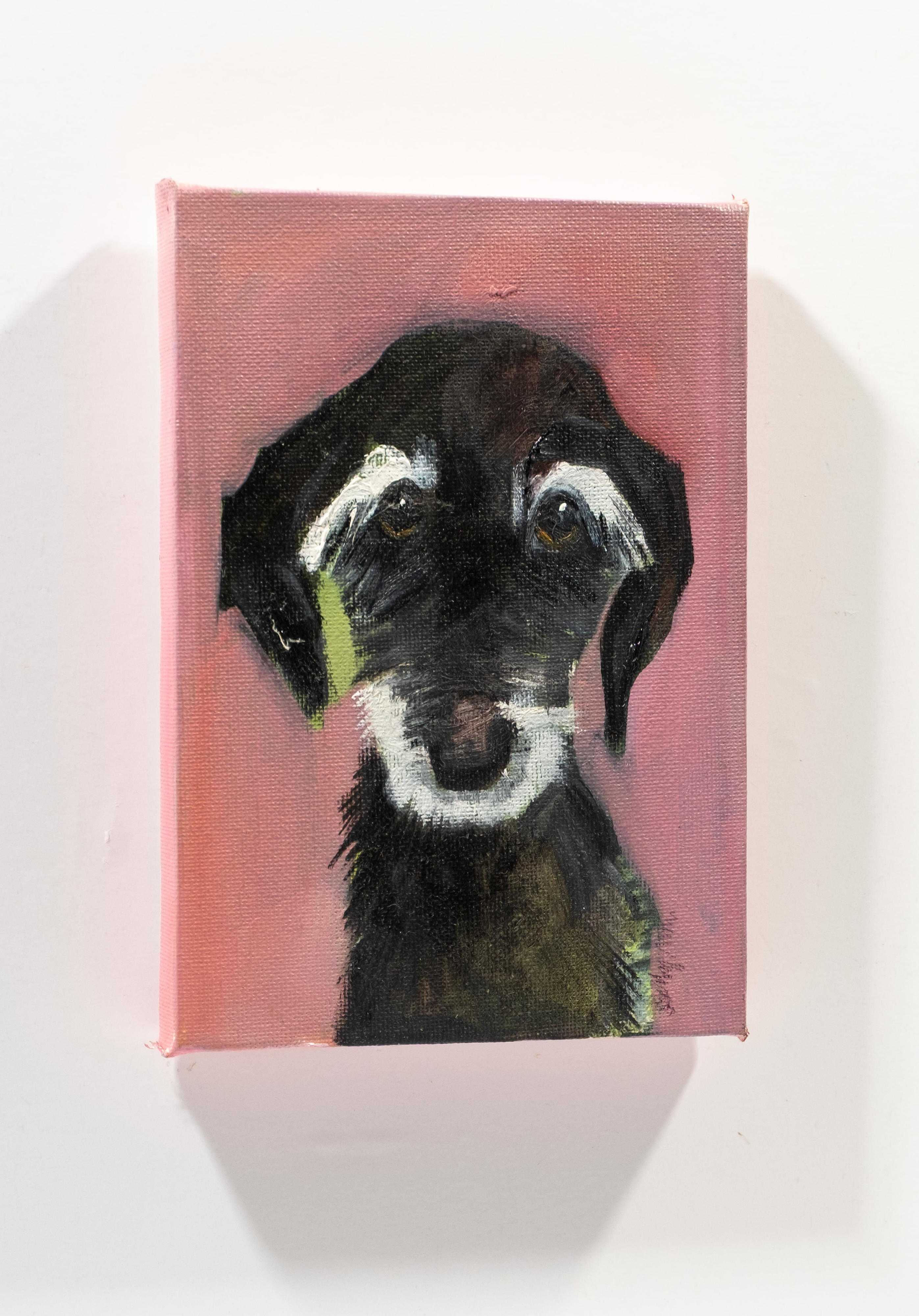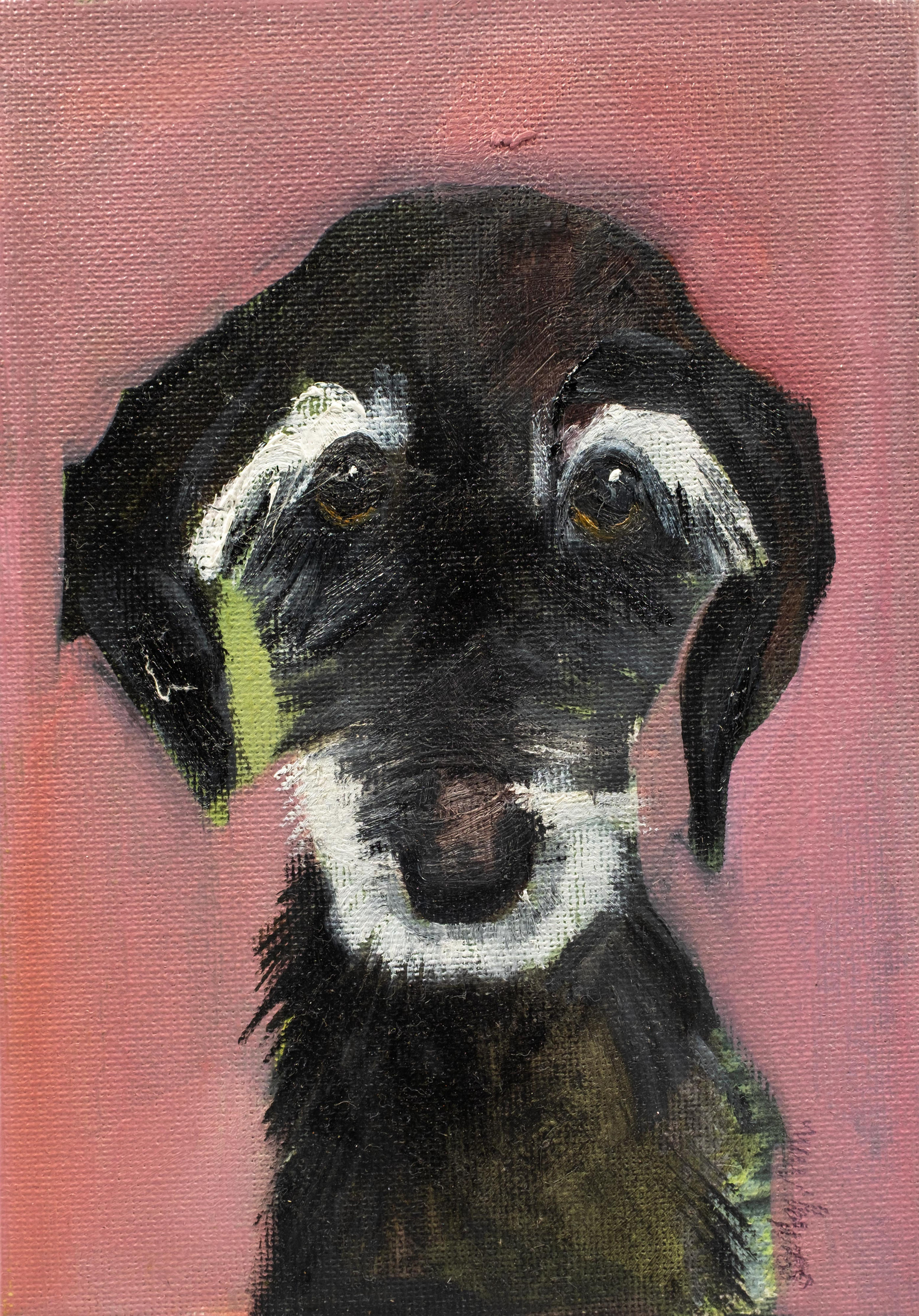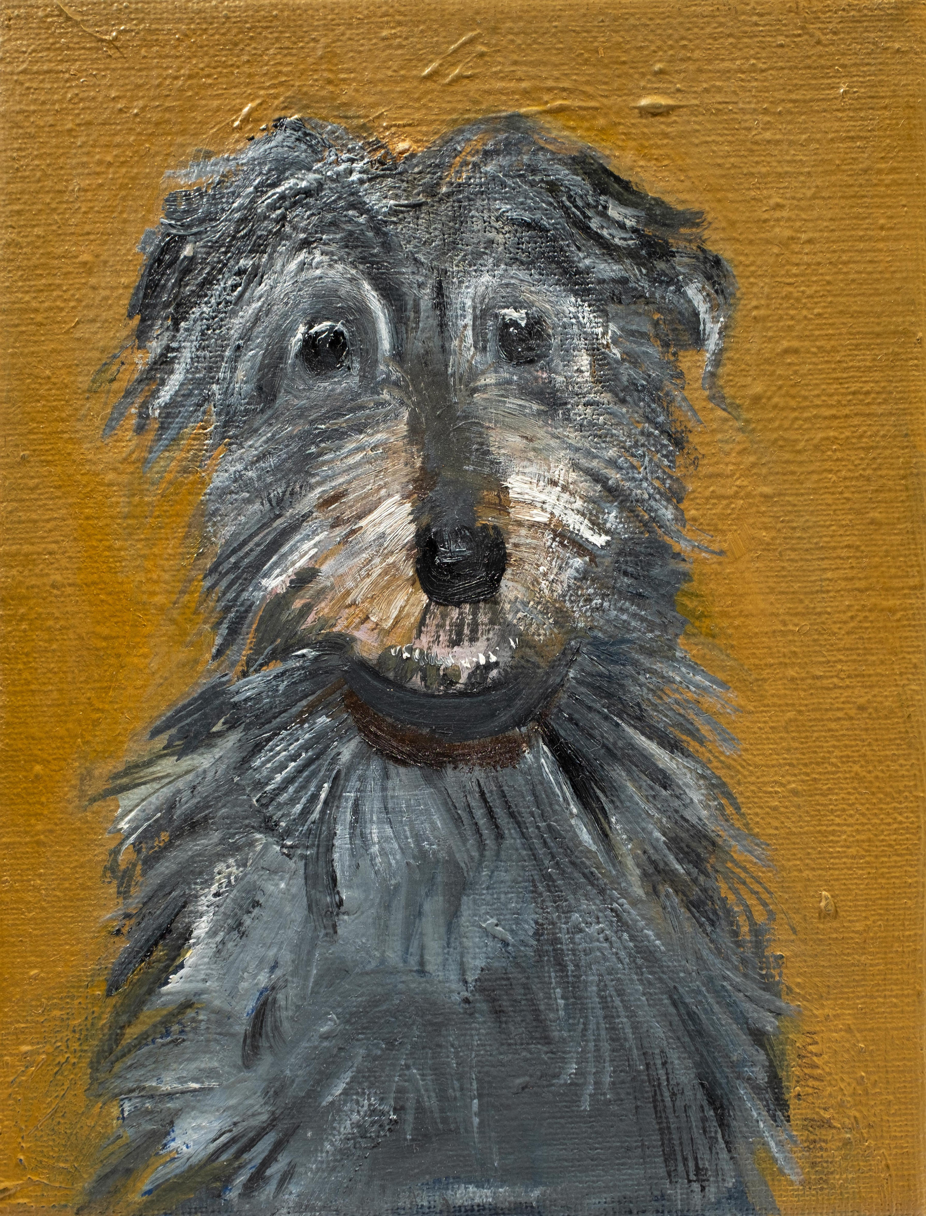 Sally Muir specialises in paintings of dogs and occasionally landscapes, rodents and people. With her dog paintings she approaches the subject as seriously as she would a person, attempting to convey the dog through a non-illustrative mark making process.