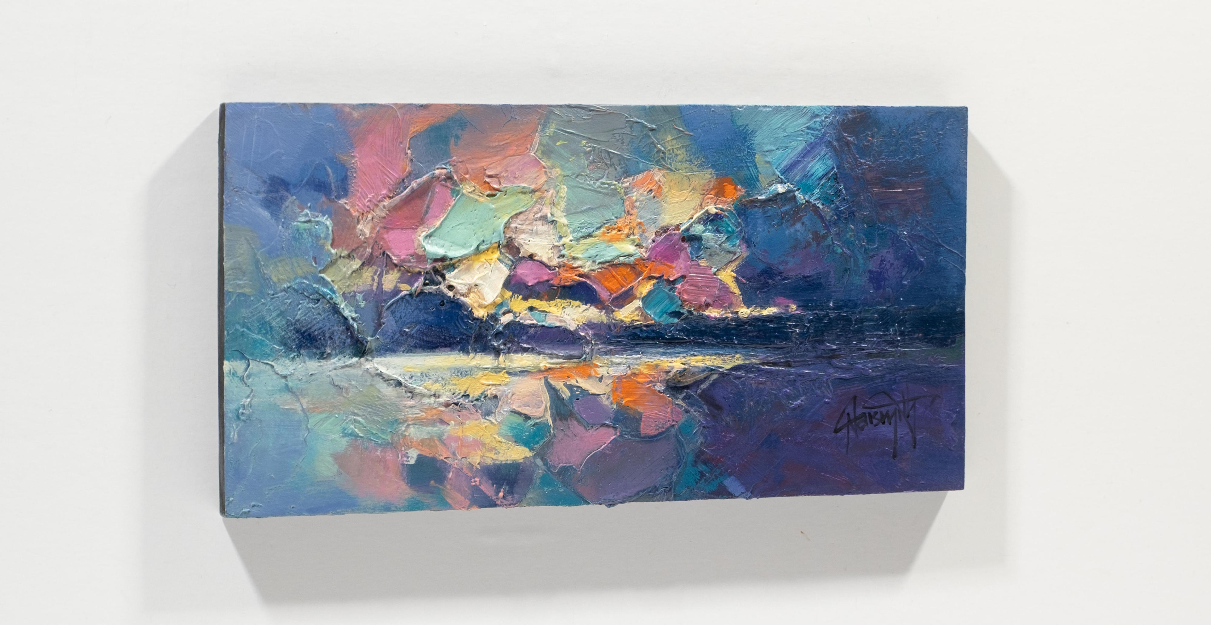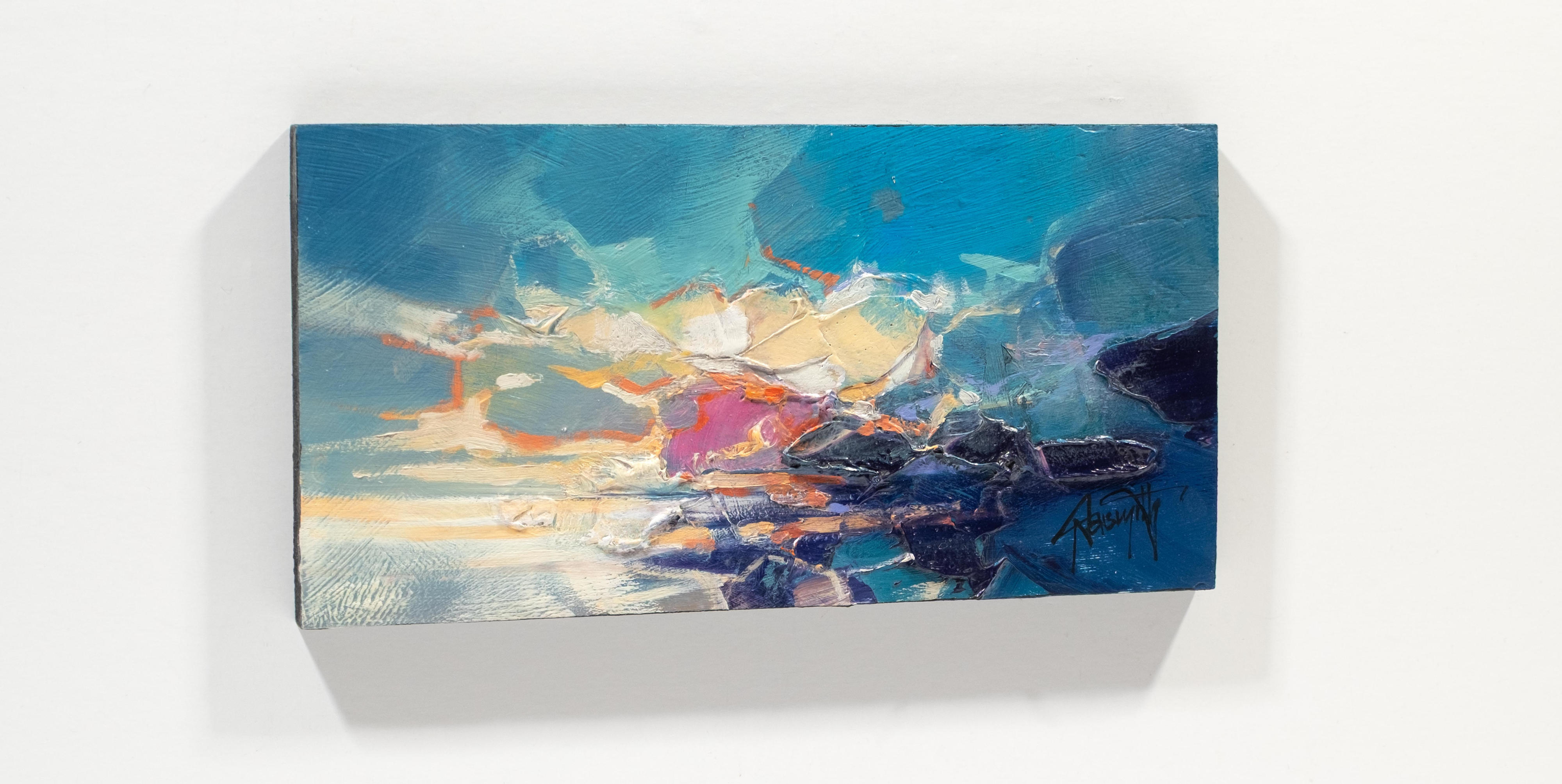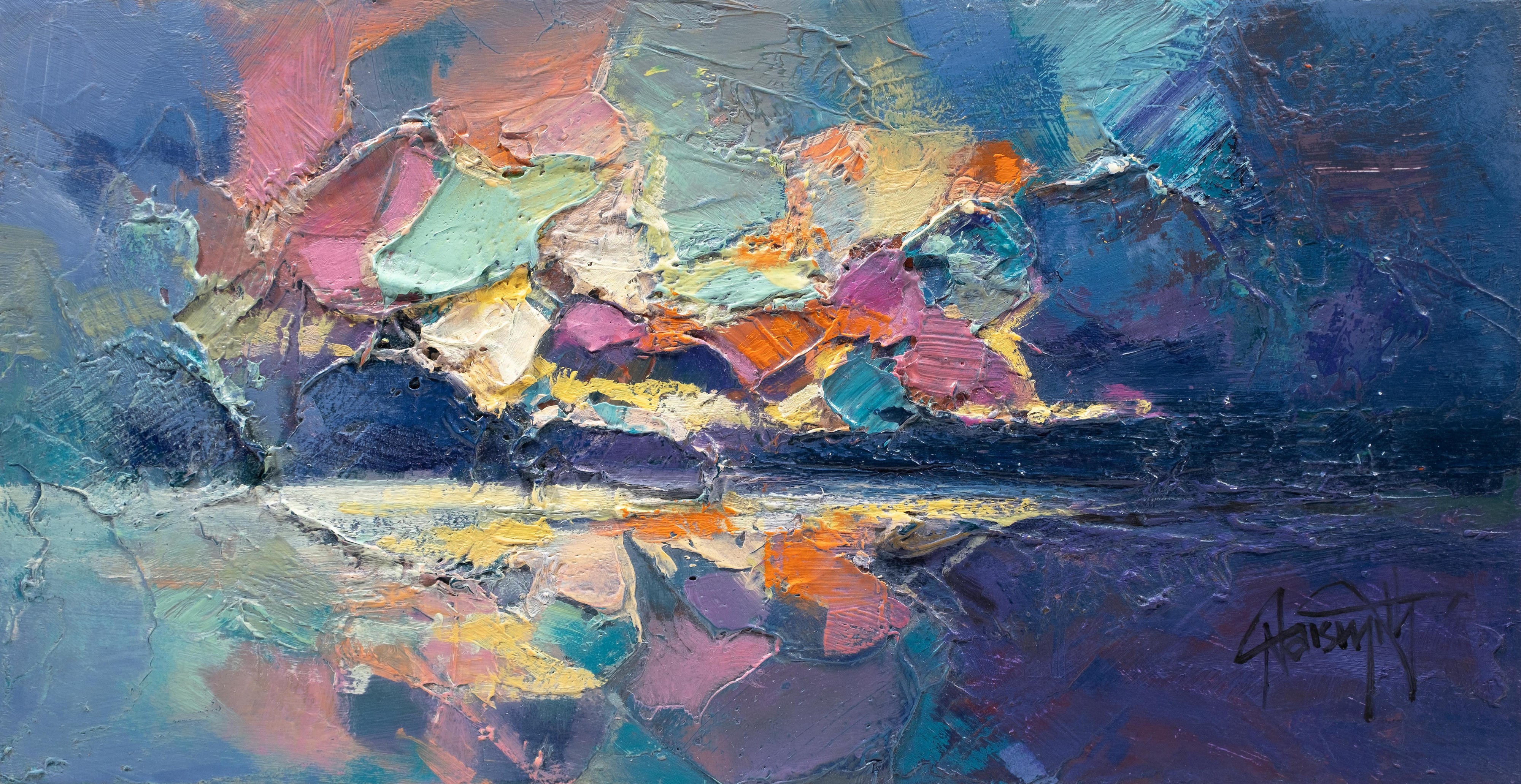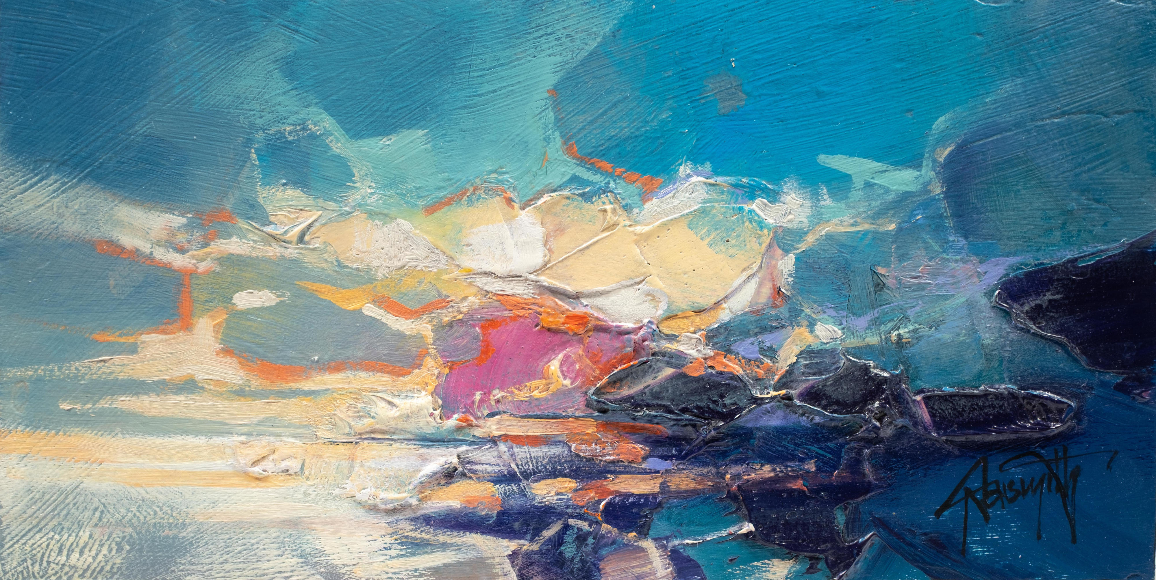 Taking his inspiration from the lochs, glens and skies of Scotland, Scott has developed a style of atmospheric abstraction. He seeks to depict not only the landscapes themselves, but also the unseen elements which have formed them. From molecular structures to atmospheric gases, he seeks to deconstruct the language of landscape painting. He brings these invisible forces of nature to the fore with a bold approach to colour theory.