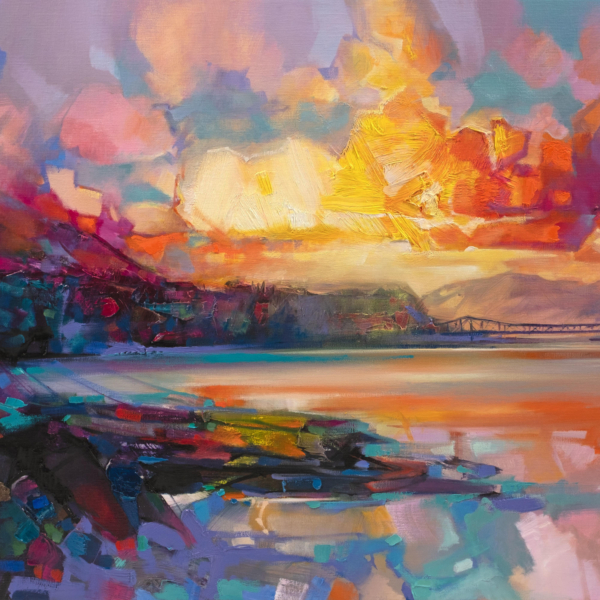 With a palette that communicates both his emotional response to the scene and its atmosphere, Scott vigorously applies various layers to the canvas, sometimes blocking the composition in with spray paint before working with a combination of acrylic and oils to represent the inherently fast changing light that illuminates the Scottish landscape. These bold and often elevated interpretations of familiar scenery ensure that the viewer can’t help but see the world as Scott does, with a great deal of optimism and hope.