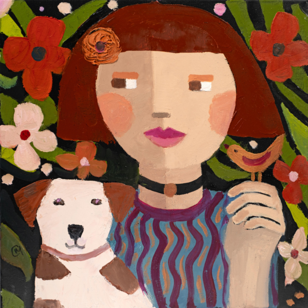 Working with a palette knife, Catriona applies thick layers of paint to the canvas creating a surface that draws viewers further into the piece, imbuing her subjects with a tactile quality that seems to further humanise these stylised individuals. Colourful and beguiling, her work is about the connective tissue that defines us, from the stories we tell to the worlds we imagine.