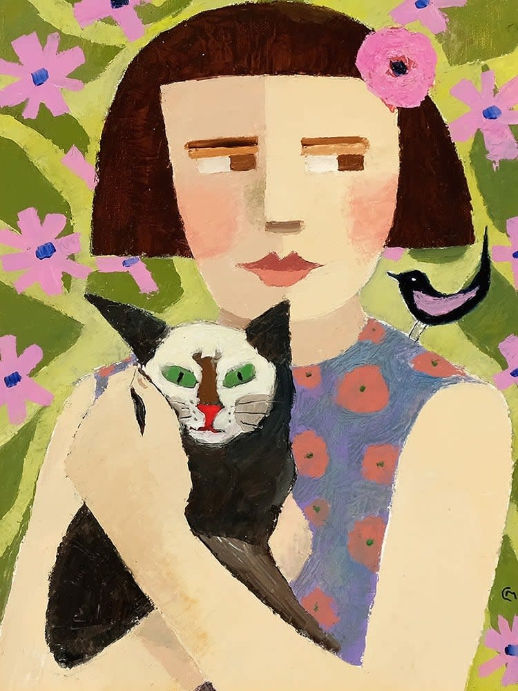 Working with a palette knife, Catriona applies thick layers of paint to the canvas creating a surface that draws viewers further into the piece, imbuing her subjects with a tactile quality that seems to further humanise these stylised individuals. Colourful and beguiling, her work is about the connective tissue that defines us, from the stories we tell to the worlds we imagine.