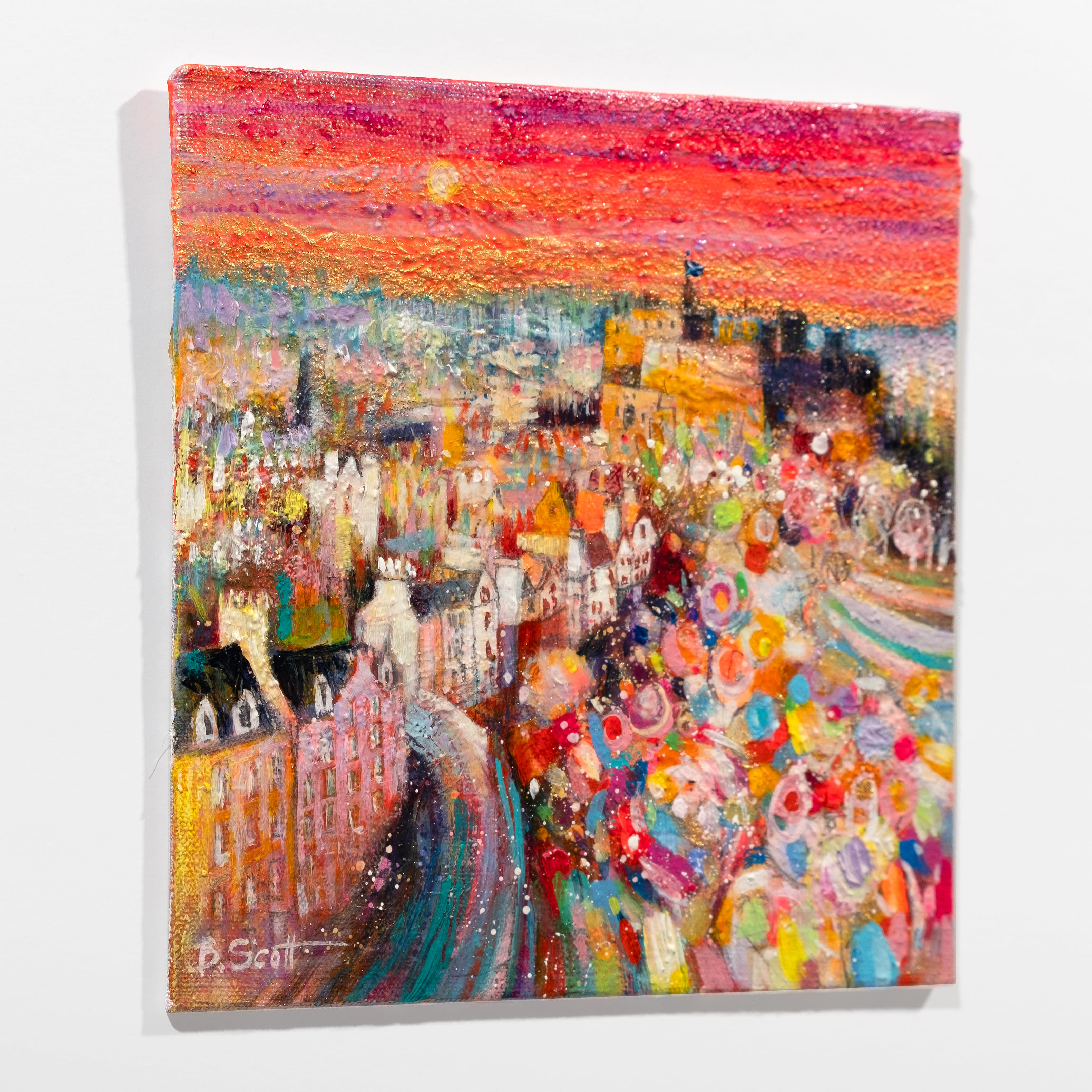 Blythe’s starting point is always reality but her paintings finish up as a combination of fact and fiction. Her Edinburgh cityscapes afford viewers an opportunity for both recognition and dreaming. Blythe seeks to create a positive and optimistic view of the world through paintings that combine harmonious colour, textural interest and often a whimsical or dream like atmosphere. Her love of texture runs through all of her paintings. For Blythe, there is pure pleasure in watching the life of the surface and the way surface texture interacts with the light. Now that we live in a world of flat digital images, this expression of texture can feel even more special.