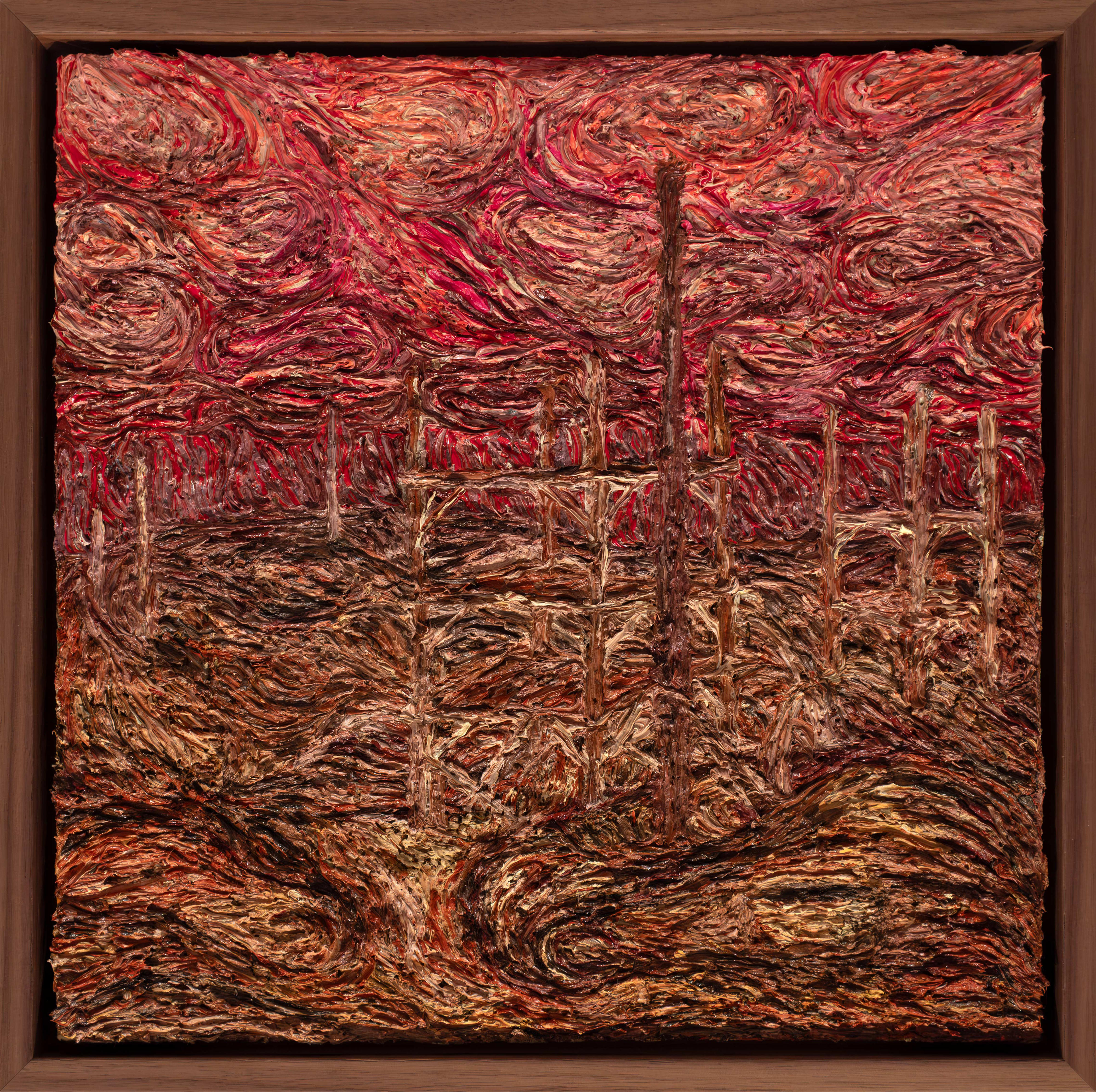 Through thick application of oil paint, Harvey repeatedly marks and removes layers of surface, allowing texture and atmosphere to build over time. This process produces dense, tactile paintings with a sensory charge—details emerge and disappear as the surface obscures and reveals, creating a sense of strangeness and quiet intensity within the image.